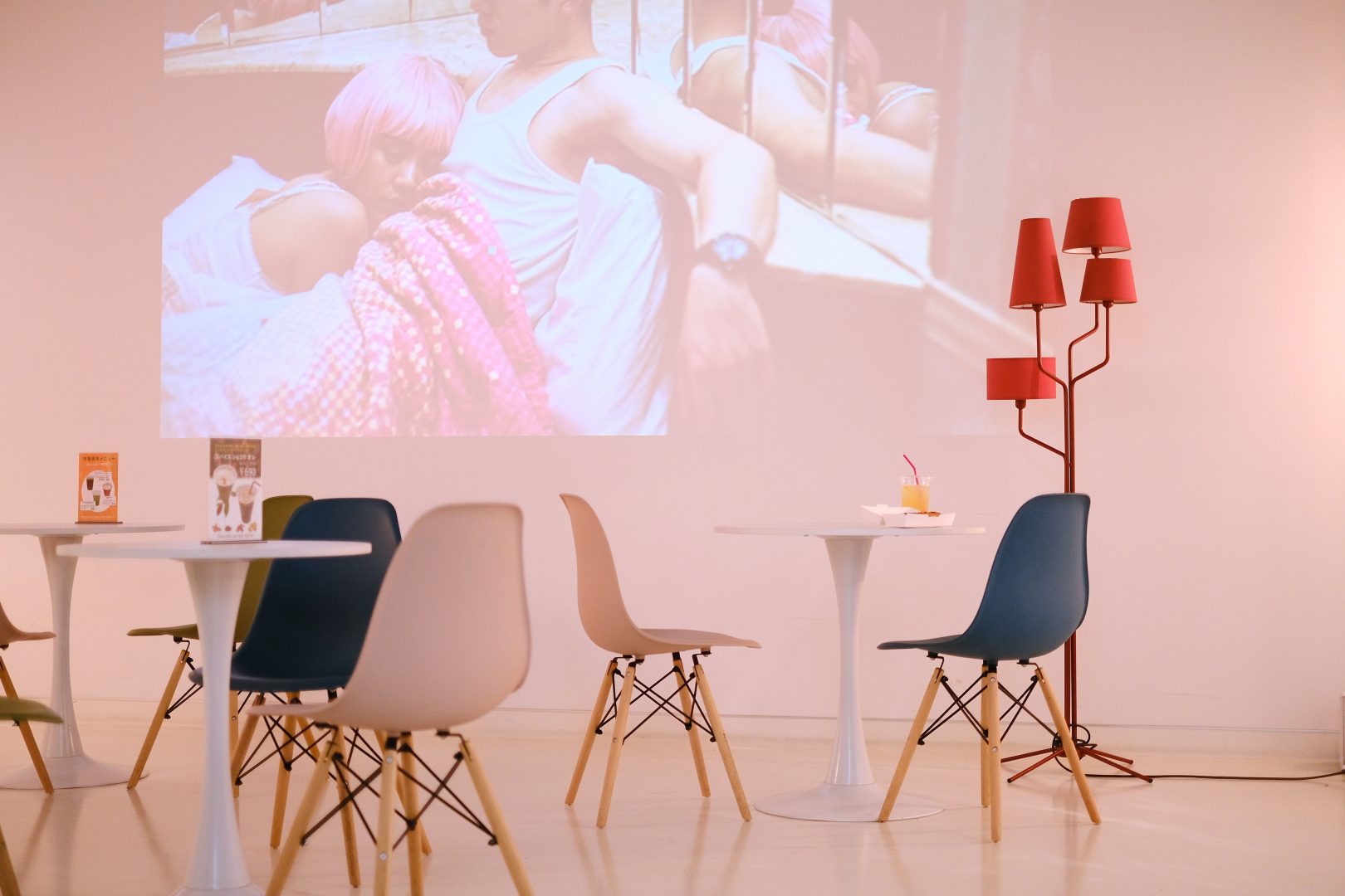 劇場の奥には映画の予告や展示などを楽しみながら過ごせるカフェスペースがあります。
