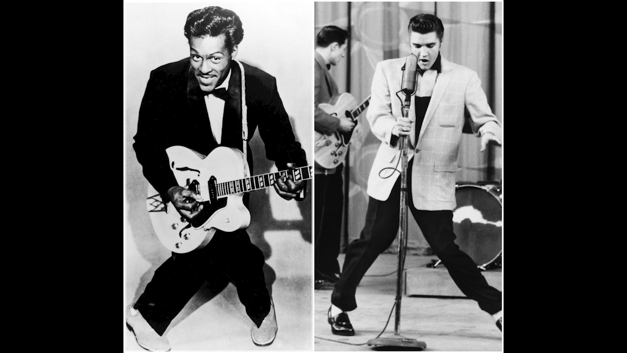チャック・ベリー(1926-2017)は、ロックンロール創始者の代表格で、1950年代にギター主導のビートとストーリーテリング的な歌詞を融合させ、ロックンロールの原型を作り上げた。彼のギター・ リフ(特に『ジョニー・B・グッド』の冒頭)は、後の無数のロックバンドに模倣され、代表曲『ジョニー・B・グッド』は、人類の文化の象徴として1977年NASAのボイジャー宇宙探査機に搭載されたゴールデンレコードに収録された。若者文化とアイデンティティを音楽で表現し、若者中心の大衆音楽という新しい潮流を築いた点が革命的であった。また、当時のアメリカでは、黒人アーティストが、主流のラジオや白人観客の前で演奏することは困難だったが、ベリーは人種の壁を超えて人気を博した初の黒人ロックンローラーで、 後続の黒人アーティストの道を切り開いたパイオニアでもある。