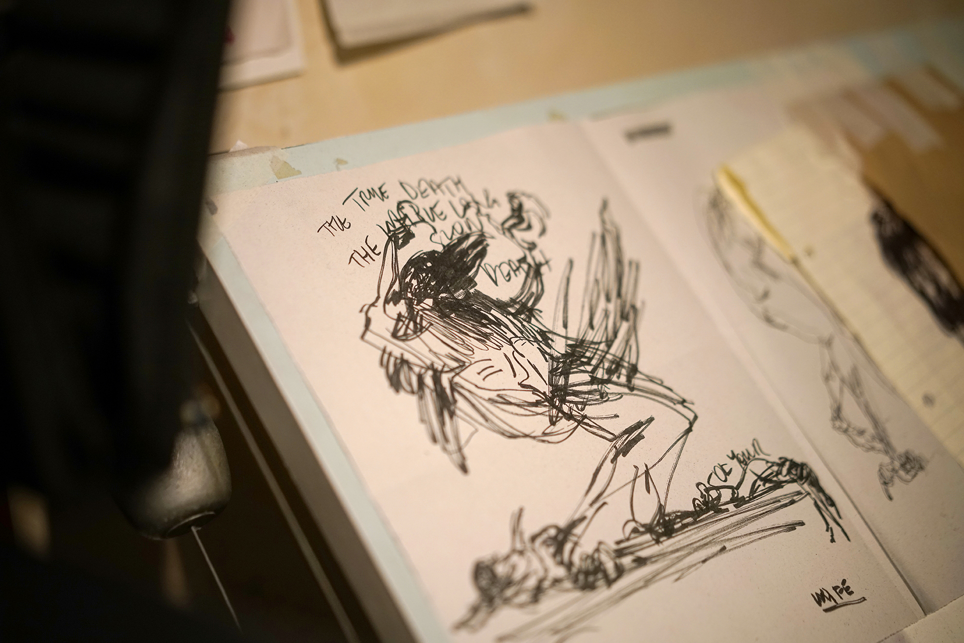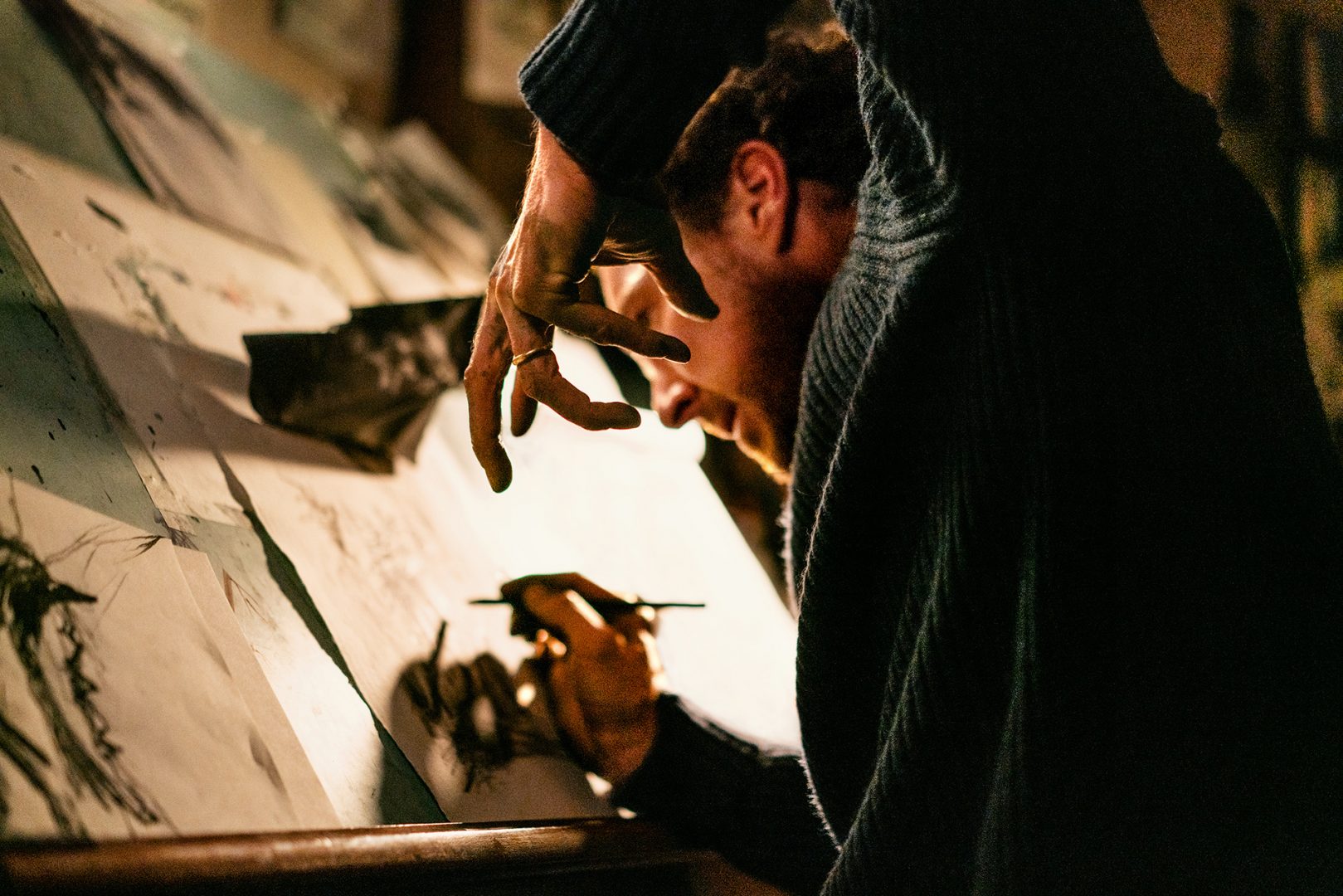 父の弟が子供たちを預かり、家でクロウの絵を描く父の前に再び声が響く――「頭に浮かんだ物語を描け!」。その時、インクがこぼれて、紙の上に黒い色が広がる。父はある雪の日を思い出す。妻が病で倒れ、彼は息子たちを連れて外に出る。それが今に至る人生の予行練習だったことにも気がつく。その時、クロウらしき鳥が、すでに後にいる。